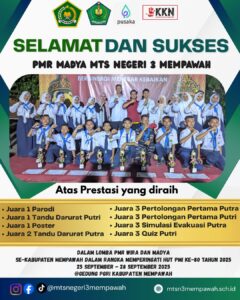 Palang Merah Remaja (PMR) Madya MTs Negeri 3 Mempawah berhasil menorehkan prestasi membanggakan dalam lomba PMR Wira dan Madya dalam rangka Hari Ulang Tahun (HUT) Palang Merah Remaja ke-80 2025, yang dilaksanakan pada 25 s.d 27 September 2025 dan diikuti oleh belasan SMA sederajat dan SMP sederajat se Kabupaten Mempawah . Adapun prestasi yang diraih yaitu: Juara 1 Parodi,  Juara  1 Tandu Darurat Putri, Juara 1 Poster, Juara 2 Darurat putra, Juara 3 Pertolongan Perama Putra, Juara 3 Pertologan Pertama Putri , Juara 3 Siimulai Evakuasi Putra dan Juara 3 Quiz Putri.